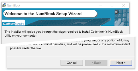 Click on the link below to download the installer. The file is very small (< 2Mb) but does require the .NET Framework 4.6.2. You will be prompted if your Windows operating system does not have this installed. https://www.cottontech.com/numblock/SetupNumBlock.msi |